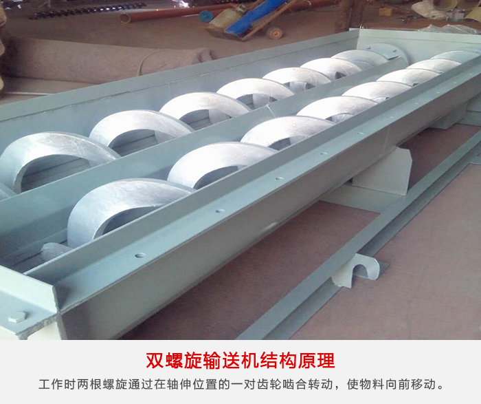 雙軸螺旋輸送機其原理是在兩條無縫鋼管內分別裝有一根實體螺旋,其中一根是左旋,另一根是右旋。工作時兩根螺旋通過在軸伸位置的一對齒輪嚙合轉動,由螺旋體的轉動,使物料作軸向移動,從而達到輸送目的。